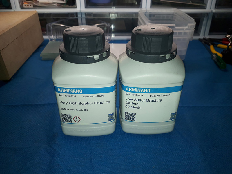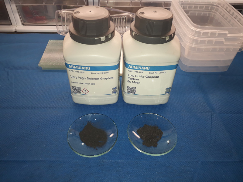 First of all it is worth mentioning that graphite powder is sold in two forms: low sulfur and high sulfur. In this experiment the role of sulfur needs to be defined and higher conductivity material must be used to make the conductive paste. One must bear in mind that grain size of graphite is a crucial parameter as the higher grains lead to paste with sand like grains and not proper for silk screen or deposition on surfaces. Below is the image of two types of graphite powder.