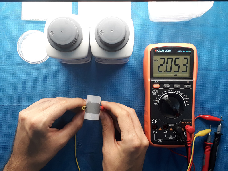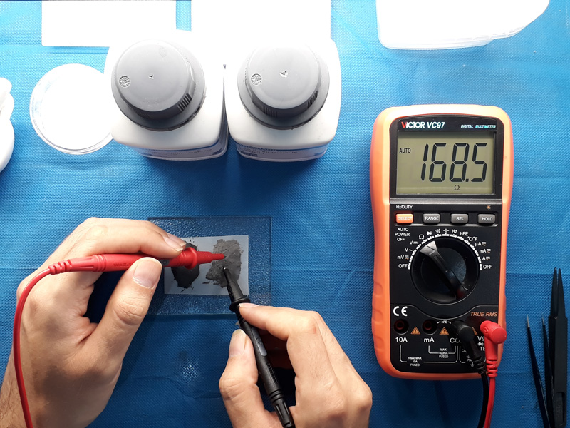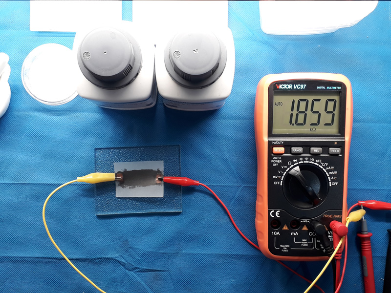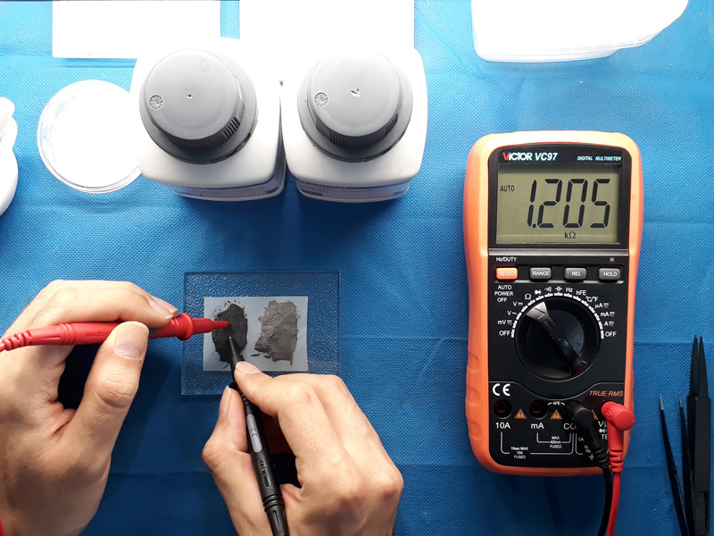 As a first experience, 1 gram of each type of graphite is added to 1 gram of sodium metasilicate powder and then distilled water is added to make a paste. Then two samples widened on the paper substrate and were left to dry. After fully drying of samples, it is time to measure the electrical resistance. The right layer is for low sulfur and the left is for the high one.