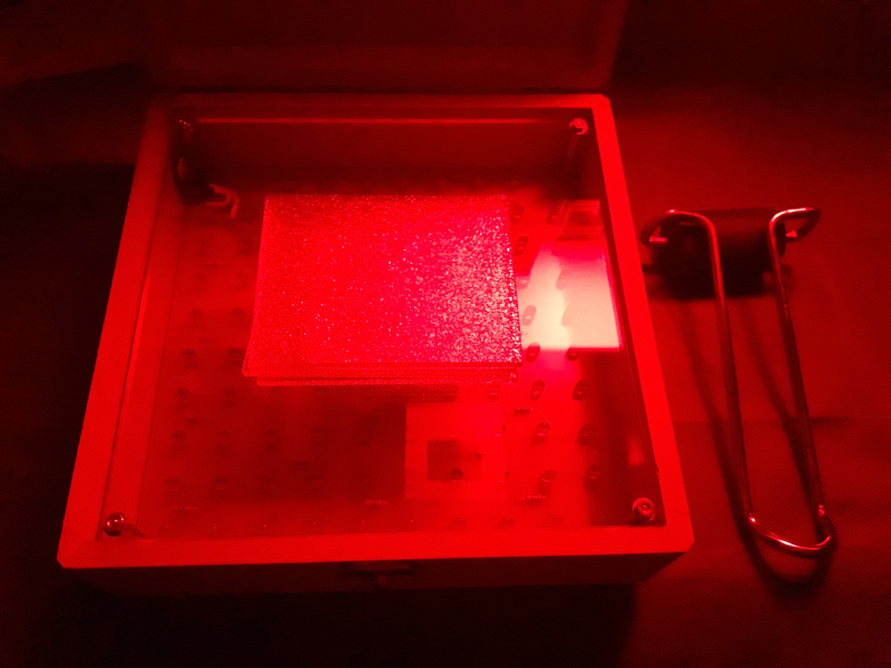 I put the whole panel and mask on the flat surface of the UV light bed. The UV light bed is hand-made too. It is made from UV oval LEDs to emit UV light. After several minutes of high exposure to UV light, the laminate is ready for next step: etching in chemical bath.